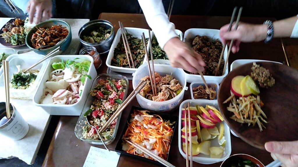 時間をかなりオーバーしてみんなお腹ぺこぺこで持ち寄りご飯会です